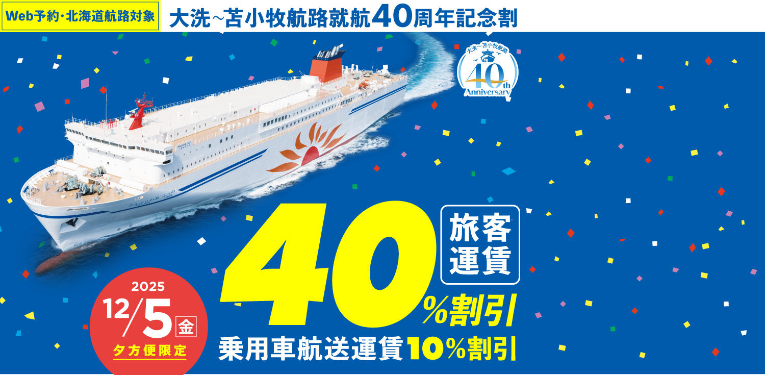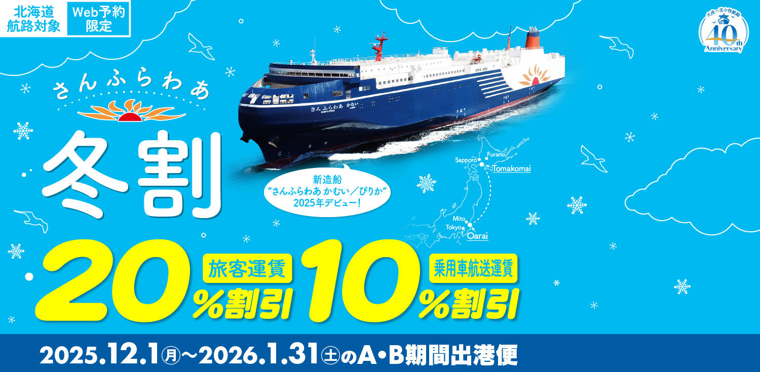 2025年12月1日(月)~2026年1月31日(土)までのA・B期間出港便で、旅客運賃20%割引、乗用車運賃10%割引になるキャンペーンを実施します!