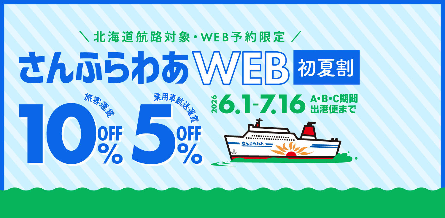 2026年6月1日(月)~2026年7月16日(木)までのA・B・C期間出港便で、旅客運賃10%割引、乗用車運賃5%割引になるキャンペーンを実施します!