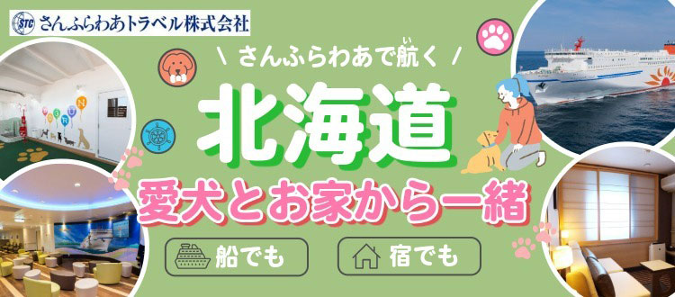 フェリーの『ウィズペットルーム』と愛犬が泊まれる北海道のお宿がセットになった、愛犬家におすすめのプラン!