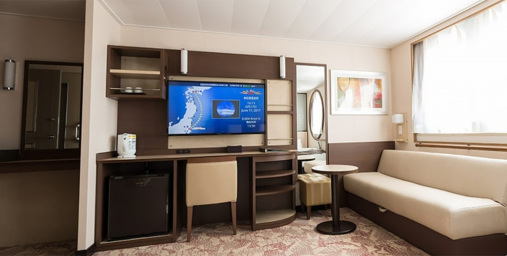 プライベートな船旅が楽しめるリラックス空間です。専用バルコニーでのんびりとお過ごしください。