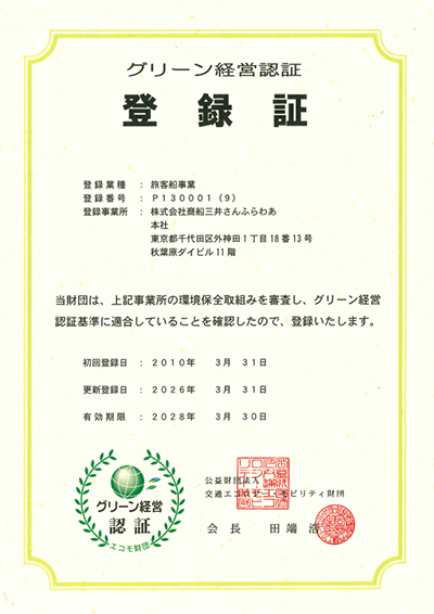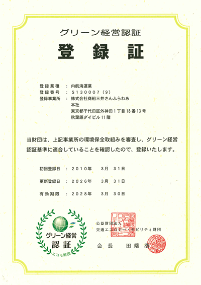 環境負荷の少ない事業運営をめざし、交通エコロジー・モビリティ財団が認証するグリーン経営認証登録を行っています。